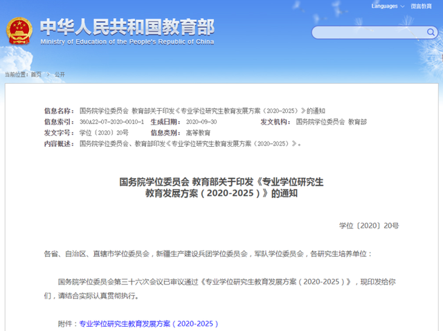 近日,國(guó)務(wù)院學(xué)位委員會(huì)、教育部印發(fā)《專業(yè)學(xué)位研究生教育發(fā)展方案(2020-2025)》(以下簡(jiǎn)稱《發(fā)展方案》),明確到2025年,以國(guó)家重大戰(zhàn)略、關(guān)鍵領(lǐng)域和社會(huì)重大需求為重點(diǎn),增設(shè)一批碩士、博士專業(yè)學(xué)位類別,將碩士專業(yè)學(xué)位研究生招生規(guī)模擴(kuò)大到碩士研究生招生總規(guī)模的三分之二左右,大幅增加博士專業(yè)學(xué)位研究生招生數(shù)量。