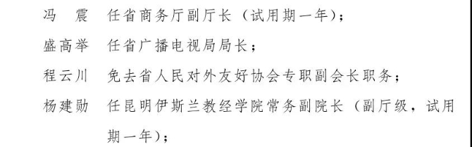 昆明信息港訊 近日,云南省人民政府發(fā)布14名干部任免職通知,馮震任省商務廳副廳長 。具體如下:
