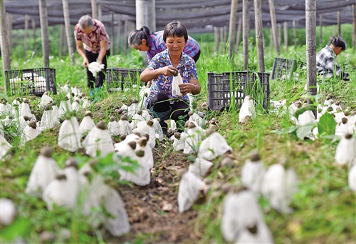 今年以來(lái),江西省宜春市袁州區(qū)采取“產(chǎn)業(yè)項(xiàng)目+基地+貧困戶”的模式,篩選發(fā)展?jié)摿ψ?、帶?dòng)能力強(qiáng)的農(nóng)業(yè)產(chǎn)業(yè)項(xiàng)目幫助貧困戶脫貧增收。截至目前,該區(qū)共安排產(chǎn)業(yè)扶貧資金3045萬(wàn)元,惠及產(chǎn)業(yè)項(xiàng)目184個(gè),帶動(dòng)20個(gè)鄉(xiāng)鎮(zhèn)256個(gè)村1萬(wàn)多戶貧困戶戶均年增收1100元以上。圖為袁州區(qū)金瑞鎮(zhèn)吼里布村食用菌種植基地,村民在采摘竹蓀。 周 亮攝(中經(jīng)視覺(jué))