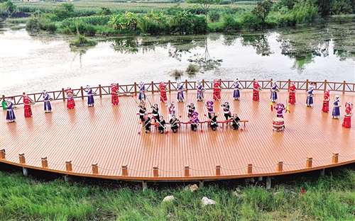 近年來(lái),廣西都安瑤族自治縣大力實(shí)施“旅游旺縣”發(fā)展戰(zhàn)略,通過(guò)發(fā)展全域旅游帶動(dòng)2萬(wàn)多名建檔立卡貧困群眾脫貧致富,占全縣貧困人口數(shù)的11.48%。圖為當(dāng)?shù)厝罕娫谶M(jìn)行民俗表演。高東風(fēng)攝(中經(jīng)視覺(jué))