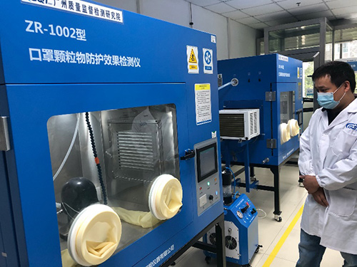 廣州質(zhì)檢院對防疫物資(口罩)做顆粒物防護(hù)效果檢測。人民網(wǎng)邢鄭/攝