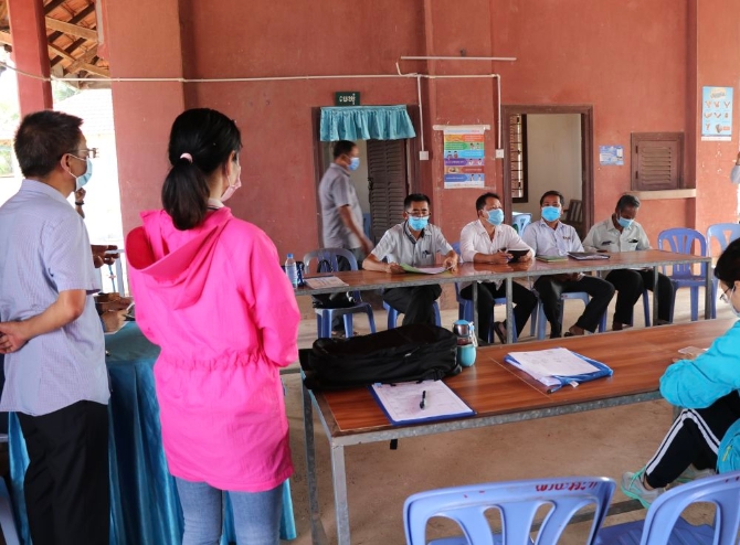 5月15日,在柬埔寨干丹省莫穆坎普縣的斯瓦安普鄉(xiāng),中國援助柬埔寨減貧示范合作項目中方專家組組長袁剛(左一)和柬文翻譯周冰姣(左二)與柬方政府官員和村民開會。(新華社發(fā),高炳南攝)