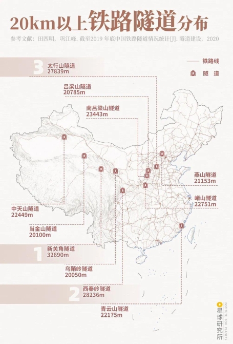 (本文僅討論山區(qū)中的鐵路和公路隧道,未涉及城市隧道和水下隧道。下圖為全國公路隧道分布熱力圖,港澳臺數(shù)據(jù)暫缺,制圖@陳志浩&王申雯/星球研究所)
