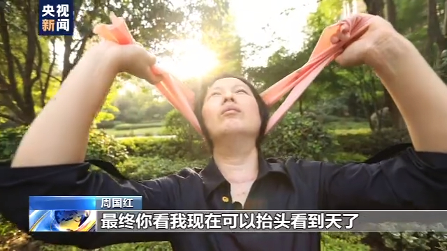 周國紅:我一開始脖子是這個(gè)樣子的,后來我唯一的信念就是我要能抬頭看到天。最終你看我現(xiàn)在可以抬頭看到天了,藍(lán)天白云還是很美的呀。?
