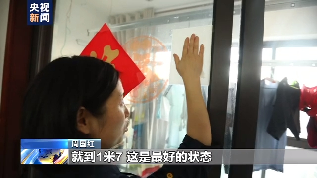 周國紅把抬胳膊訓(xùn)練叫做“爬墻”,她家中的這道玻璃移門上,貼著一張身高量表,上面的這些線條都是周國紅給自己定下的小目標(biāo)。每天多努力一點(diǎn),胳膊就能向上多爬一截。?