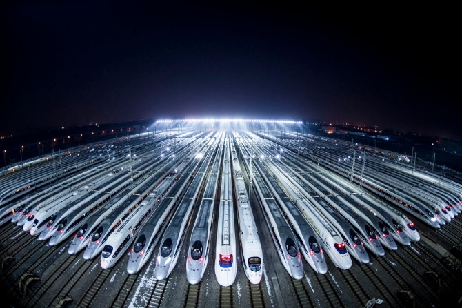 ↑動車組??吭谖錆h動車段的存車線上,準備進行檢修和保溫作業(yè)(2018年2月1日攝)。新華社記者 肖藝九 攝
