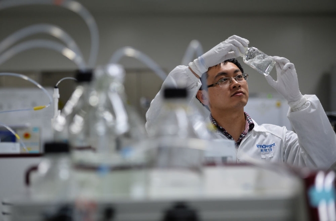 ↑在信達生物制藥(蘇州)有限公司研發(fā)實驗室,一名工程師在觀察藥物中間產品外觀(2017年5月9日攝)。新華社記者 李響 攝