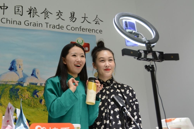 ↑主播在第三屆中國糧食交易大會期間為內蒙古雜糧產品直播帶貨(2020年10月20日攝)。新華社記者 林超 攝
