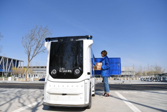 ↑菜鳥驛站雄安市民服務中心店店員孫靜云將快遞件放置在無人物流車上(2019年4月1日攝)。新華社記者 牟宇 攝