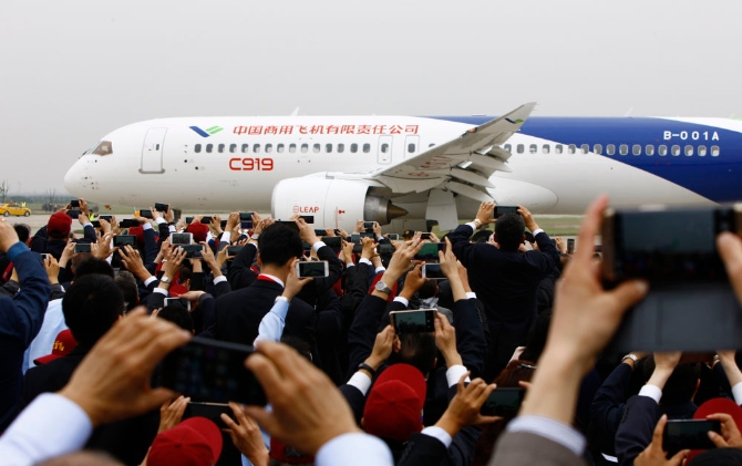↑國產大型客機C919在上海浦東國際機場首飛成功(2017年5月5日攝)。新華社記者 方喆 攝