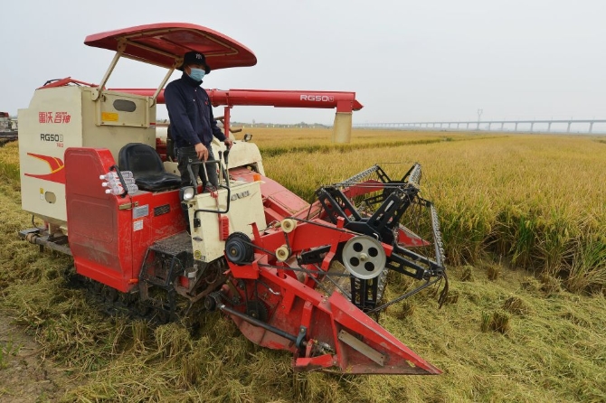 ↑袁隆平院士團隊在山東省青島市城陽區(qū)上馬街道種植的5000畝耐鹽堿水稻迎來豐收,這是工人在稻作改良示范基地駕駛收割機收割海水稻(2020年10月16日攝)。新華社發(fā)(王海濱 攝)