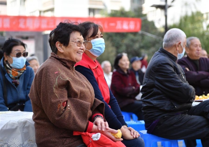 10月23日,老人們在西安市大明宮街道明園社區(qū)欣賞迎重陽文藝演出。新華社記者 張博文 攝