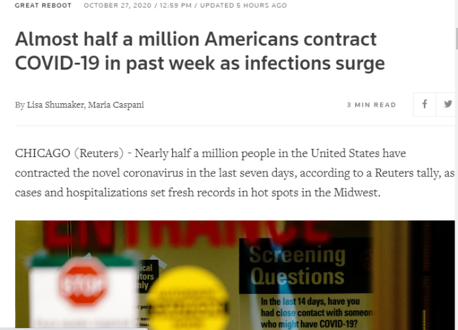 △路透社10月27日報(bào)道,近50萬美國人在過去一周感染新冠病毒