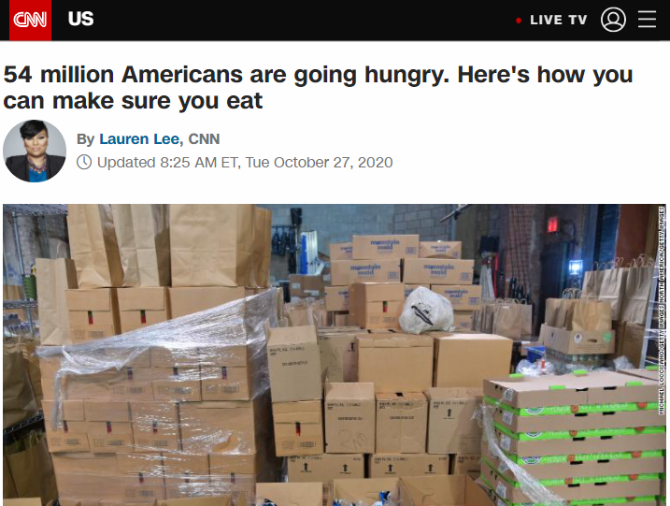 △CNN援引非營利組織“賑饑美國”數(shù)據(jù)稱,美國有5400萬人可能很快面臨食品短缺