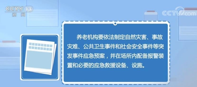 《辦法》規(guī)定,養(yǎng)老機(jī)構(gòu)要依法制定自然災(zāi)害、事故災(zāi)難、公共衛(wèi)生事件和社會安全事件等突發(fā)事件應(yīng)急預(yù)案,并在場所內(nèi)配備報(bào)警裝置和必要的應(yīng)急救援設(shè)備、設(shè)施。