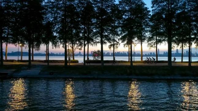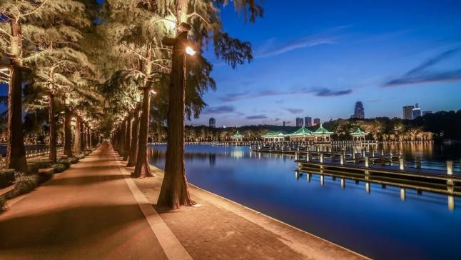 騎行東湖綠道,用力感受晚風(fēng),趁著夜色中穿梭在湖中。遠(yuǎn)處的水杉林靜靜地倒影在湖面,湖邊的點(diǎn)點(diǎn)星光也漸漸連成一線,這樣的風(fēng)光與白天是截然不同。