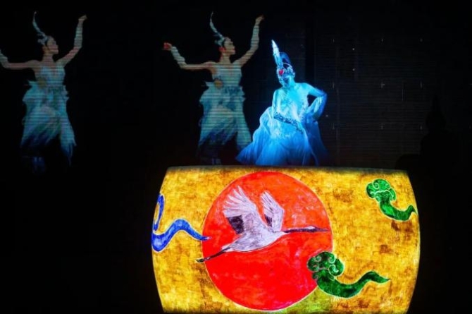 夜幕降臨,在炫彩燈光的裝點(diǎn)之下,撫琴仙子、黃鶴仙子、水霧、激光齊上陣,講述仙鶴緣起的傳說,這是《夜上黃鶴樓》,鵝池光影流動(dòng),引人入勝。