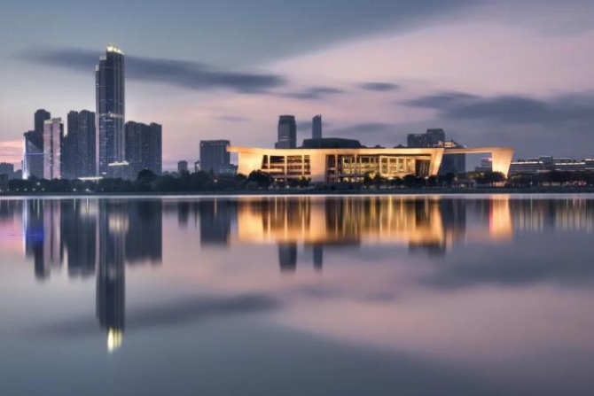 白天不懂夜的美,華燈亮起的流線型建筑,融化在月湖的夜色溫柔。