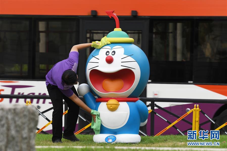 11月3日,一名工作人員在新加坡國(guó)家博物館為多啦A夢(mèng)展品消毒。 新加坡國(guó)家博物館于10月31日至12月27日舉行“多啦A夢(mèng)時(shí)空歷險(xiǎn)記”展覽。 新華社發(fā)(鄧智煒/攝)