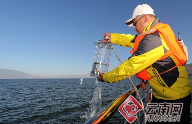 洱海水質(zhì)監(jiān)測技術(shù)人員在監(jiān)測船上對洱海水質(zhì)進行取樣。記者 楊崢 攝