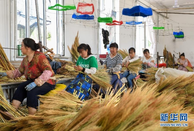 貧困戶在巴林左旗林東鎮(zhèn)扶貧車間內(nèi)制作笤帚(2019年8月5日攝)。 新華社記者 彭源 攝