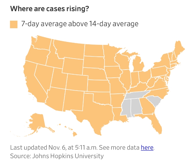 △美國哪些地區(qū)病例數(shù)出現(xiàn)增長?(圖片來源:《華爾街日?qǐng)?bào)》)