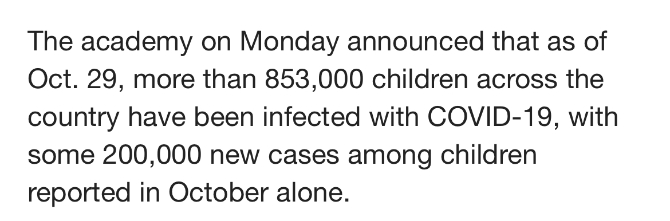 此外,據(jù)美國兒科學(xué)會(huì)數(shù)據(jù),截至當(dāng)?shù)貢r(shí)間10月29日,美國已有超過85.3萬兒童確診新冠肺炎,單是10月份,就有約20萬兒童確診新冠肺炎。