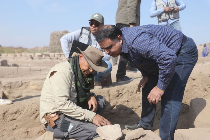 1月12日,在埃及盧克索,中埃盧克索孟圖神廟聯(lián)合考古項(xiàng)目中方執(zhí)行領(lǐng)隊(duì)、中國社會科學(xué)院考古研究所副研究員賈笑冰(左)在現(xiàn)場工作。新華社發(fā)
