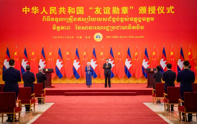 11月6日,習(xí)近平主席在人民大會(huì)堂為柬埔寨太后莫尼列頒授中華人民共和國(guó)“友誼勛章”。她也是“友誼勛章”設(shè)立以來(lái)第九位獲得此榮譽(yù)的外國(guó)友人?!坝颜x勛章”是中國(guó)國(guó)家對(duì)外最高榮譽(yù)勛章。