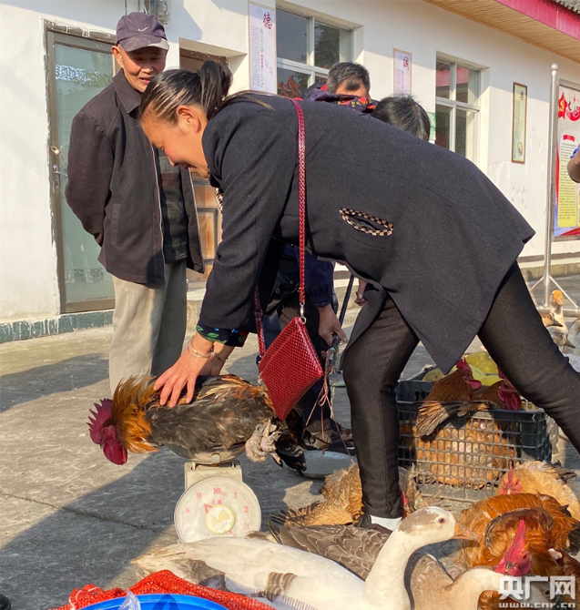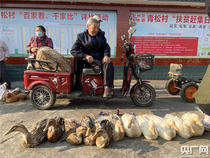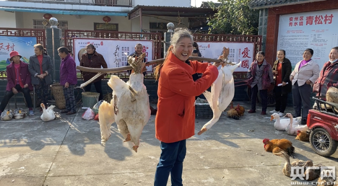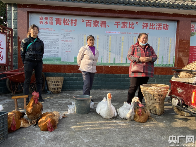在四川綿陽安州區(qū)秀水鎮(zhèn)青松村每月的“扶貧趕集日”上,村委會(huì)的大院里一派熱鬧的景象。村民們帶著自家種植養(yǎng)殖的農(nóng)作物和家禽來趕集,大院里地上各自成攤,打圈擺著五谷、各類蔬菜、家禽和活魚,村民們說笑聊天,雞鴨鵝唱起“和聲”。院子里不時(shí)的走進(jìn)購物的人群,這些人購物有個(gè)特點(diǎn),一次購買量都比較大。不到一個(gè)小時(shí)的時(shí)間里,多位村民攤位上的農(nóng)副產(chǎn)品就銷售一空。青松村第一書記羅歡說,“像這樣一次趕集,一戶村民家的家禽起碼可以給他們帶來六七百元的收入,蔬菜能夠帶來兩三百的收入?!边@個(gè)扶貧趕集日深得村民的喜歡,每到趕集日村里有一種過節(jié)般的喜悅和熱鬧的氣氛。