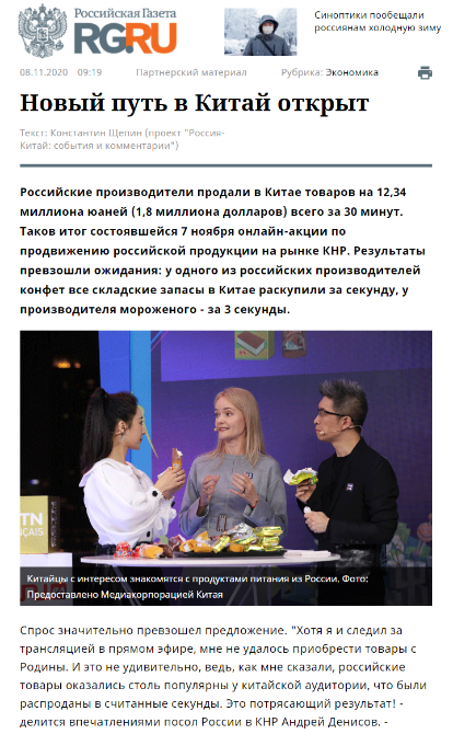 當(dāng)?shù)貢r間11月7日晚,“足不出滬 享購好物”直播帶貨活動俄羅斯專場在上海舉行,銷售異常火爆。短短30分鐘內(nèi),銷售額累計達1234萬元人民幣(約合180萬美元),其中參加直播帶貨活動的俄羅斯紫皮糖出口企業(yè)在中國的庫存1秒鐘內(nèi)售罄,而一款來自俄羅斯的冰激凌也僅用了3秒便銷售一空。