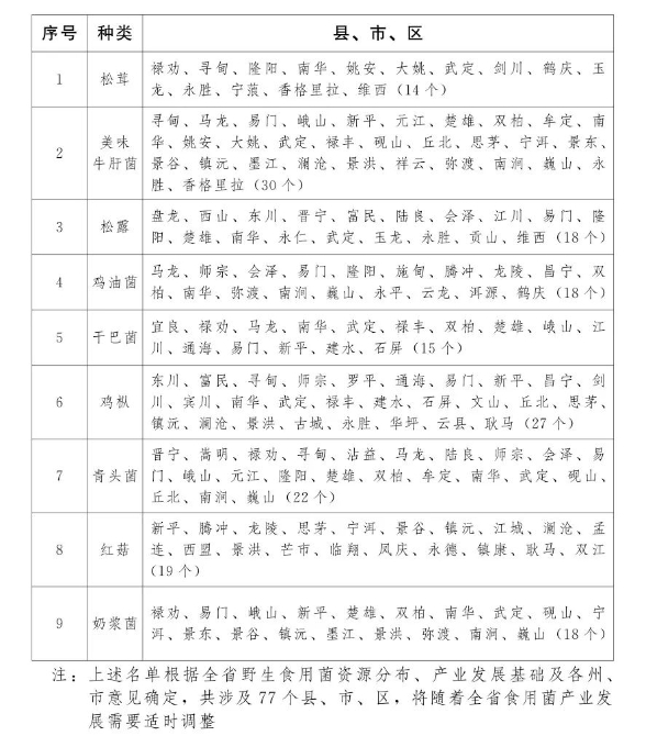 9種野生食用菌保育及供應(yīng)基地縣名單