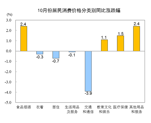 10月份,全國居民消費(fèi)價(jià)格環(huán)比下降0.3%。其中,城市下降0.3%,農(nóng)村下降0.5%;食品價(jià)格下降1.8%,非食品價(jià)格上漲0.1%;消費(fèi)品價(jià)格下降0.6%,服務(wù)價(jià)格上漲0.1%。