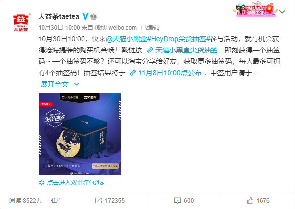 ▲天貓小黑盒尖貨「滄?!沟耐茝V微博獲得8522萬人次閱讀,超17萬人轉發(fā)。