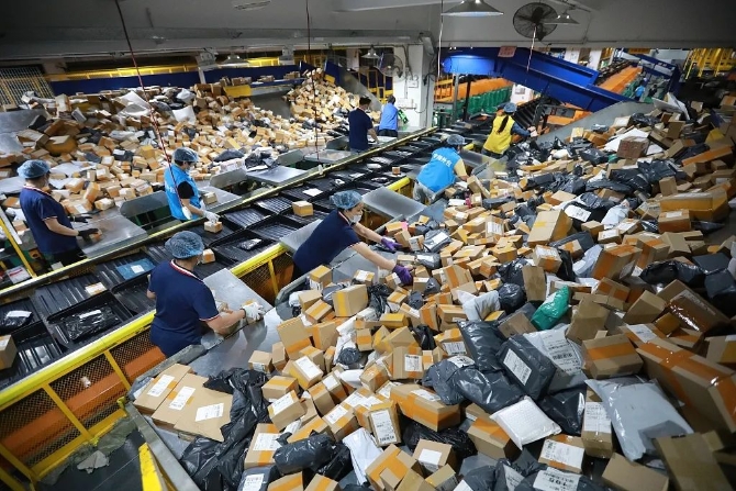 2020年11月11日晚,廣東東莞郵政快遞分揀點。來源:視覺中國