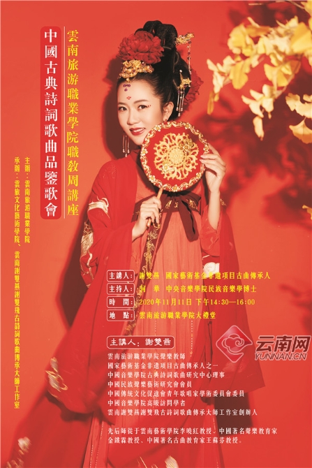 11月11日下午,著名女高音、國家藝術(shù)基金非遺項(xiàng)目古曲傳承人謝雙燕在云南旅游職業(yè)學(xué)院主講的“中國古典詩詞歌曲品鑒歌會(huì)”拉開帷幕。