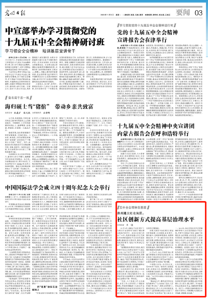 “當(dāng)前,人口普查工作正在進(jìn)行,社區(qū)工作人員利用入戶調(diào)查的契機(jī),將加印的解讀十九屆五中全會(huì)精神的社區(qū)報(bào)送到居民和商戶手中,把會(huì)議精神通過這種方式宣傳到千家萬(wàn)戶?!毙碌曜由鐓^(qū)居委會(huì)黨支部書記周瑛說。