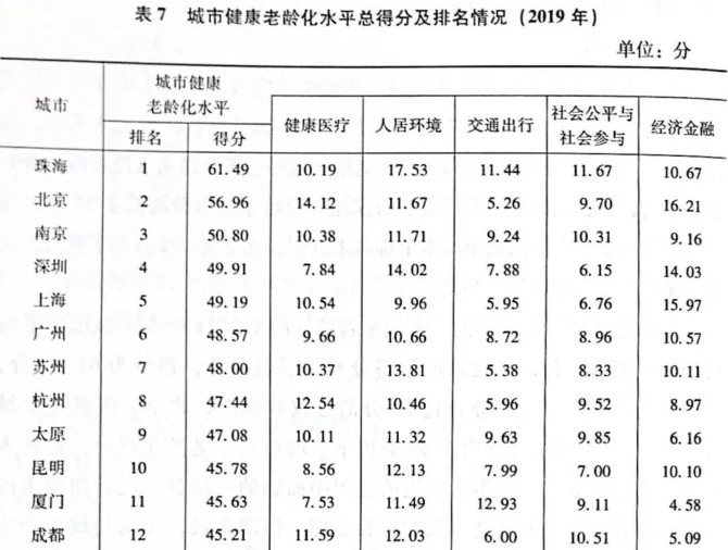 從此次報告的整體來看,珠海、北京、南京、深圳和上海的健康老齡化水平位于全國前5位,昆明位列第10。