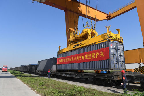 廣西南寧國際鐵路港內(nèi)工人在吊裝跨境班列集裝箱。新華社記者陸波岸攝