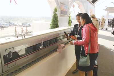 △中泰鐵路合作項(xiàng)目一期工程開工儀式上,當(dāng)?shù)貐⒂^者拍攝中國“復(fù)興號(hào)”高速列車模型