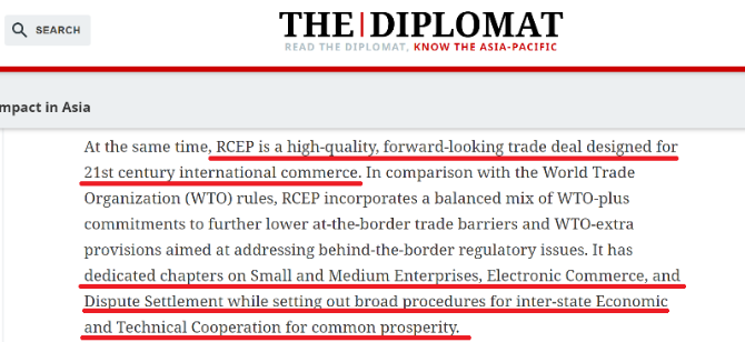 《外交官》雜志網(wǎng)站稱,RCEP是為21世紀(jì)國際貿(mào)易而設(shè)計(jì)的高質(zhì)量、前瞻性的貿(mào)易協(xié)定。與世界貿(mào)易組織的規(guī)則相比,RCEP的規(guī)則更加均衡,并專門針對(duì)中小企業(yè)、電子商務(wù)與貿(mào)易爭端的解決,同時(shí)為國際經(jīng)濟(jì)合作、技術(shù)合作規(guī)定了共同的發(fā)展規(guī)則。