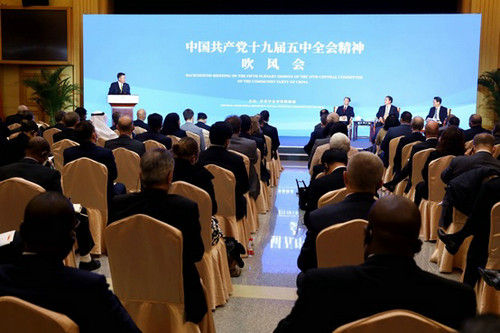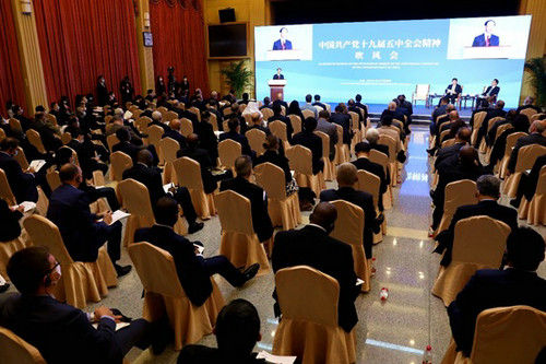中共中央對(duì)外聯(lián)絡(luò)部9日為外國(guó)駐華使節(jié)舉辦十九屆五中全會(huì)精神吹風(fēng)會(huì),包括60多位駐華大使在內(nèi)的100多個(gè)國(guó)家的高級(jí)外交官出席。