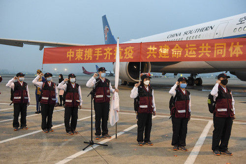 為了協(xié)助柬埔寨應(yīng)對疫情,中國赴柬埔寨抗疫醫(yī)療專家組于3月23日飛抵金邊,這是疫情暴發(fā)后,中國向周邊派遣的第一支抗疫醫(yī)療隊。隨同包機(jī)抵達(dá)金邊的還有柬埔寨急需的抗疫醫(yī)療物資。
