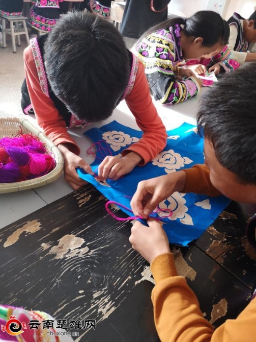 三臺(tái)鄉(xiāng)屬于彝族山區(qū)鄉(xiāng),近年來(lái),隨著社會(huì)的不斷繁榮發(fā)展和受外界文化的沖擊影響,當(dāng)?shù)卣莆找妥宕汤C技藝的人越來(lái)越少了,這一民間彝繡傳統(tǒng)技藝面臨失傳的境地。為進(jìn)一步保護(hù)好彝族刺繡傳統(tǒng)文化,培養(yǎng)中學(xué)生對(duì)彝族刺繡文化興趣愛(ài)好,三臺(tái)鄉(xiāng)綜合初級(jí)中學(xué)在每周一的下午開(kāi)設(shè)了特色活動(dòng)課,學(xué)校采取課堂培訓(xùn)與課外自學(xué)相結(jié)合的培訓(xùn)方式,邀請(qǐng)民間繡娘授課,授課內(nèi)容為傳統(tǒng)彝族刺繡基礎(chǔ)技法、本土彝繡內(nèi)涵、彝繡設(shè)計(jì)、花樣繡片等等。三臺(tái)鄉(xiāng)綜合初級(jí)中學(xué)初二(二)班的李秀蘭同學(xué)高興的告訴記者:“我是彝族,從小外婆和媽媽就教我繡花,學(xué)校開(kāi)設(shè)特色課之后,我的興趣更濃了,繡法也大有長(zhǎng)進(jìn)了,以后我還要繡出更多的繡品”。