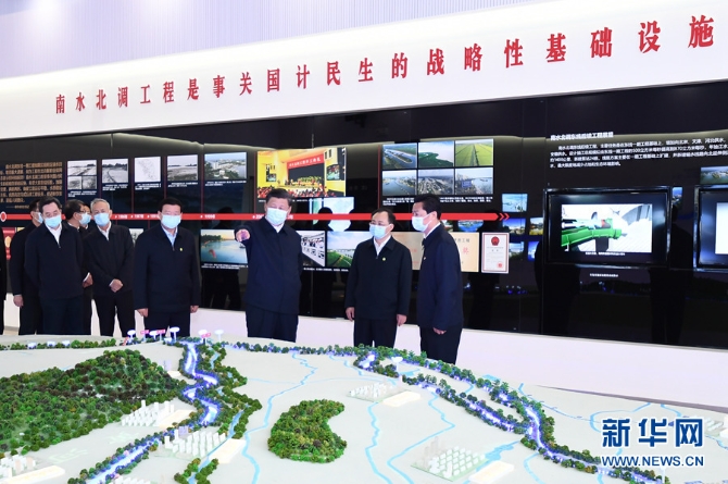 一個(gè)大型沙盤模型直觀地呈現(xiàn)了中國(guó)大地上水資源大范圍大規(guī)??鐓^(qū)域調(diào)配的壯闊景象,習(xí)近平總書記駐足凝望——
