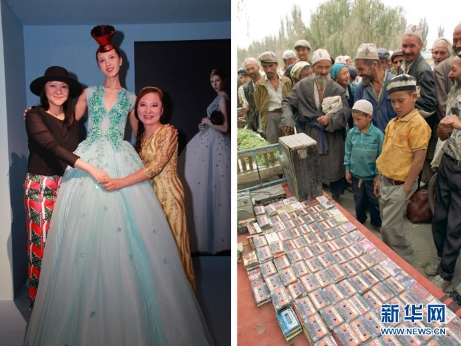 拼版照片:左圖為在2016年巴黎時裝周秀場后臺,來自新疆哈密的農(nóng)村婦女熱娜古麗·素批(右)和設(shè)計師秦旭(左)與身著時裝的模特合影留念。熱娜古麗是新疆哈密的一名民間繡娘,近年來,在當(dāng)?shù)卣姆龀窒?,熱娜古麗開辦了刺繡專業(yè)合作社,并與內(nèi)地時裝設(shè)計師合作生產(chǎn)高端時裝(資料照片,采訪對象提供);右圖為1995年,在新疆莎車縣,各族群眾逛“巴扎”(集市)時在新產(chǎn)品攤前駐足,對各種音響和磁帶產(chǎn)生濃厚興趣(新華社記者 武純展 攝)。