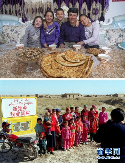 拼版照片:上圖為2019年2月17日,在位于新疆喀什地區(qū)澤普縣桐安鄉(xiāng)移民新村的新家中,熱娜古麗·喀爾曼(左二)與家人一起合影(新華社記者 趙戈 攝);下圖為1998年,新疆裕民縣新地鄉(xiāng)牧民在定居點合影,紀(jì)念新生活的開始(新華社記者 周文斌 攝)。新華社發(fā)