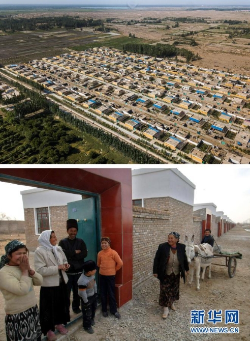 拼版照片:上圖為2020年5月22日拍攝的新疆莎車縣伊什庫力鄉(xiāng)闊坦墩村的富民安居房(無人機照片,新華社記者 王菲 攝);下圖為2007年12月,新疆策勒縣固拉哈瑪鄉(xiāng)剛剛搬進(jìn)抗震安居新房的維吾爾族農(nóng)民在相互問候祝賀(新華社記者 沈橋 攝)。新華社發(fā)