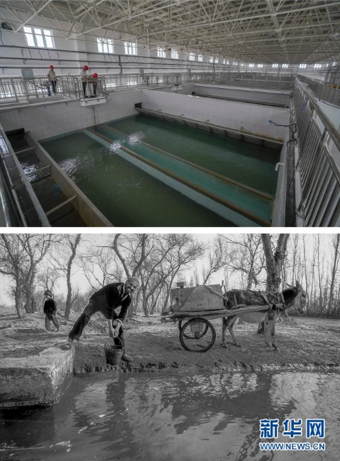 拼版照片:上圖為2020年6月8日,在新疆喀什地區(qū)城鄉(xiāng)供水總水廠,工作人員檢查清水池工作情況。這些安全水將通過近112公里的主管道直達(dá)伽師縣,供應(yīng)當(dāng)?shù)鼐用裼盟ㄐ氯A社記者 趙戈 攝);下圖為20世紀(jì)90年代,新疆和田地區(qū)策勒縣一名農(nóng)民在一處澇壩邊取水(新華社記者 沈橋 攝)。新華社發(fā)