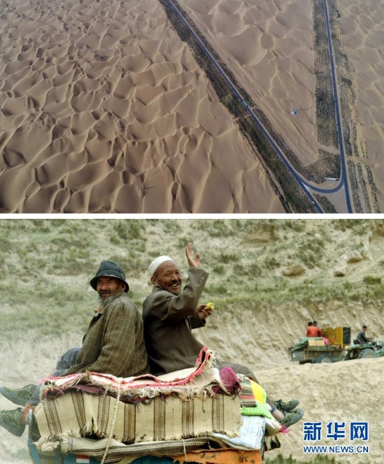 拼版照片:上圖為2017年9月22日拍攝的塔里木沙漠公路。近年來,新疆持續(xù)加大交通基礎(chǔ)設(shè)施建設(shè)力度,加快完善對內(nèi)對外交通運輸大通道(無人機照片,新華社記者 胡虎虎 攝);下圖為2008年9月20日,新疆策勒縣博斯坦鄉(xiāng)阿熱勒力克村的維吾爾族村民在搬家途中(新華社記者 沈橋 攝)。新華社發(fā)